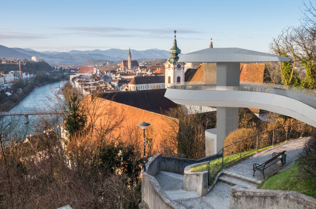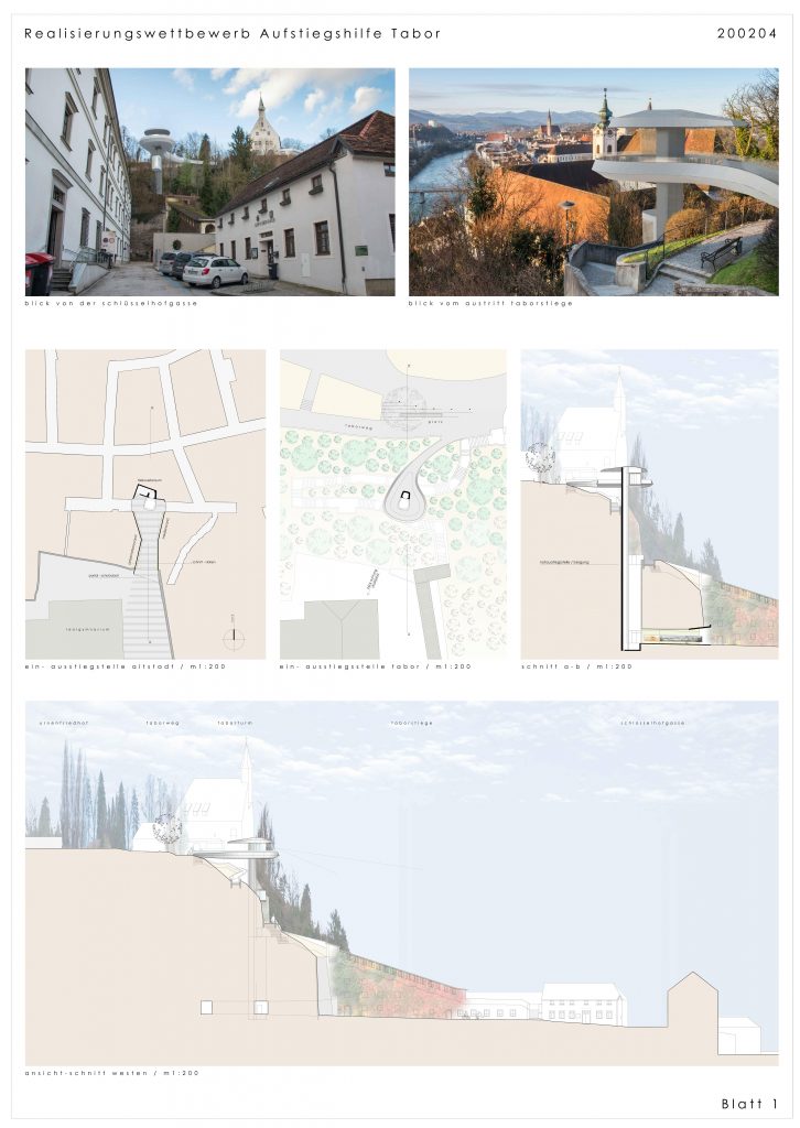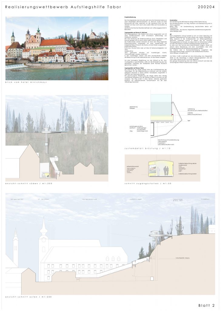 Der Grundgedanke des Entwurfes sieht eine frei fahrende Kabine an einer bergseitigen Betonkonstruktion vor. Bewusst wurde auf eine Einhausung des Liftes verzichtet, um die imposante Sicht auf die Altstadt von Steyr nicht durch eine zweite Hülle samt Konstruktion zu mindern. Sämtliche technischen Bauteile befinden sich witterungsgeschützt im Betonkern. Der Eingangsbereich des Stollens wird etwas ausgeweitet und mit einer Portalkonstruktion samt Schutzdach (Steinschlag) aus Stahlbeton versehen. Die rohe Sicherung der Stollenausweitung durch Torkretbeton wird bewusst gezeigt und nur durch einen hellen Anstrich gefärbt. Die Stollenwände werden einerseits mit einer dem Weg folgenden Präsentationsvitrine andererseits mit einer Medienvitrine mit integrierter Beleuchtung für die Decke und den Boden ausgestattet. Die Anbindung des Steges erfolgt nahe des Austrittsbereiches der Taborstiege. Um die Steganbindung zu betonen wird die nördlich gelegene Grüninsel zu einem kleinen Verweilplatz umgestaltet in welchem der Taborweg einmündet. Die geschwungene Wegführung des Steges bietet eine ständig wechselnde Perspektive auf die Altstadt mit Blick ins Ennstal und die Voralpen und endet in einer kleinen, teilweise gedeckten Plattform mit beeindruckender Panoramasicht auf die über 1000-jährige Eisenstadt.