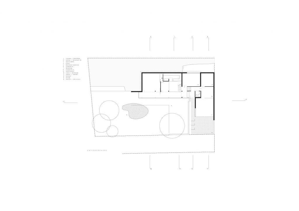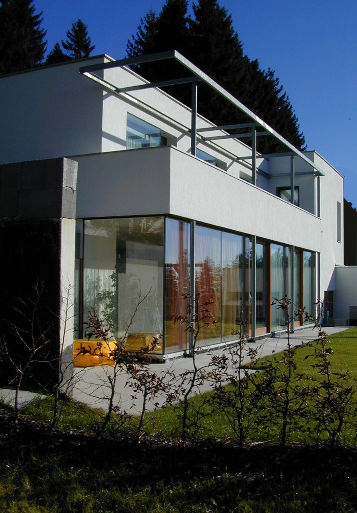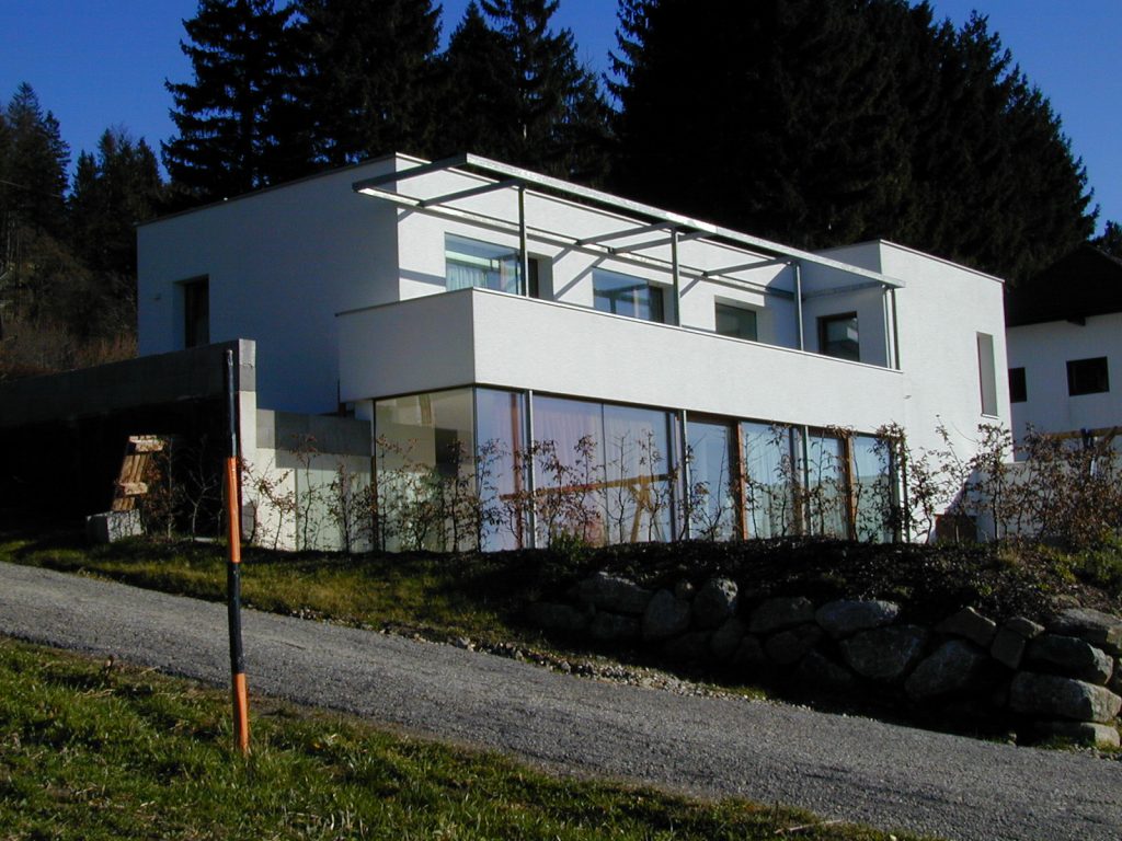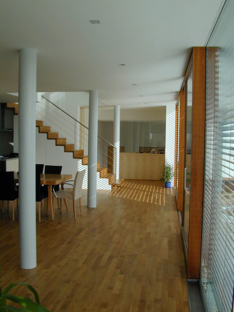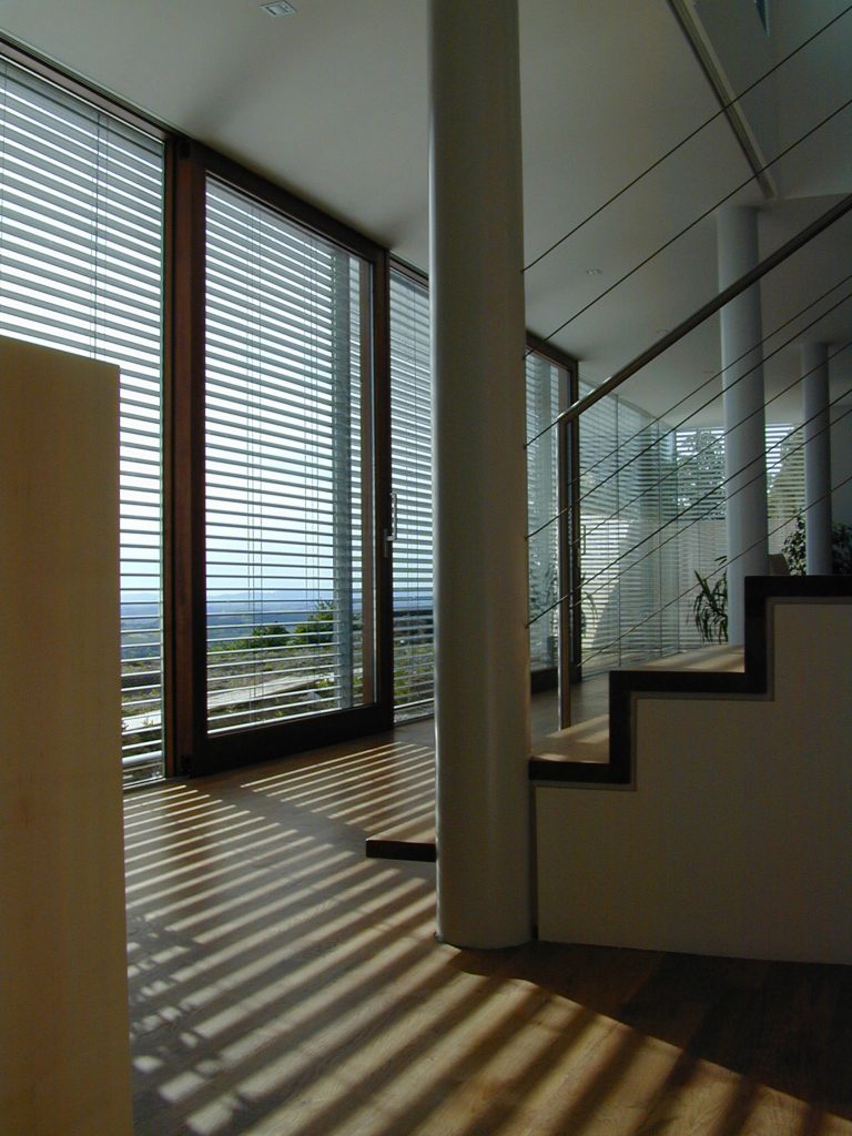 Das halb in den Hang gebaute Einfamilienwohnhaus beherbergt im Untergeschoss die halböffentlichen Bereiche des Alltags (Wohnen, Essen, …). Die schon erwähnte Glasfassade gewährt einen großartigen Ausblick und schenkt tageslichtdurchflutete Räumlichkeiten. Die baulich dirigierte Dramaturgie der Ausblicke und Richtungswechsel setzt sich im privaten Erdgeschoss mit den Schlaf- und Kinderzimmern bzw. Sanitärbereichen im Obergeschoß fort. Die, wie eine Skulptur eingefügte, im Detail exakt ausgeführte Treppe führt dorthin. Über die Zimmer gelangt man auf den vorgelagerten Balkon, der durch die gemauerte Brüstung und eine schwebend-leicht wirkende Überdachung ein vor Einblicken und Wetter geschütztes „Draußen-Sein“ ermöglicht.