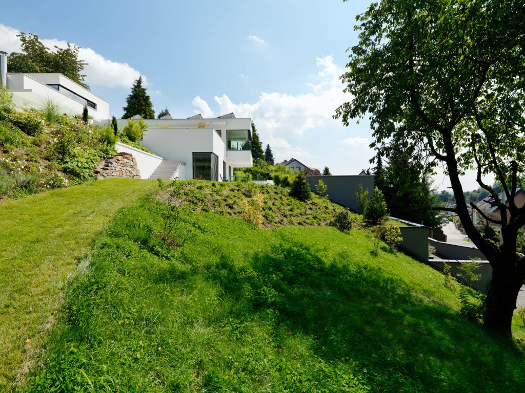 Ein rigoroser Bebauungsplan ließ nur eine sehr eingeschränkte Möglichkeit der Situierung des Hauses auf einem sehr weitläufigen, steilen Hanggrundstück zu.