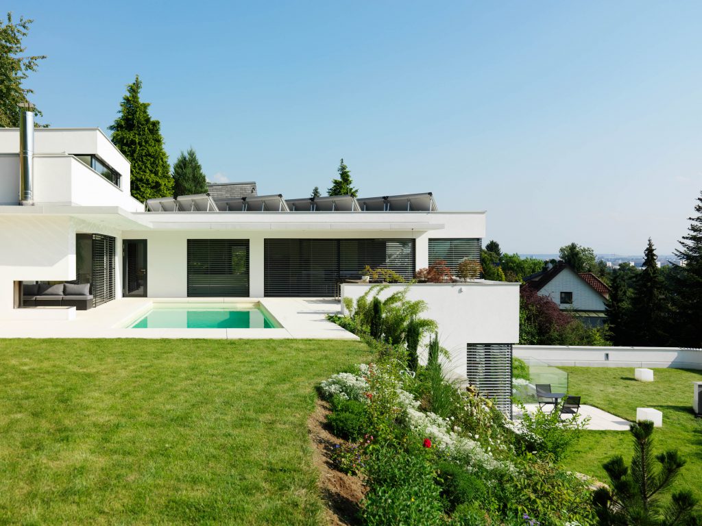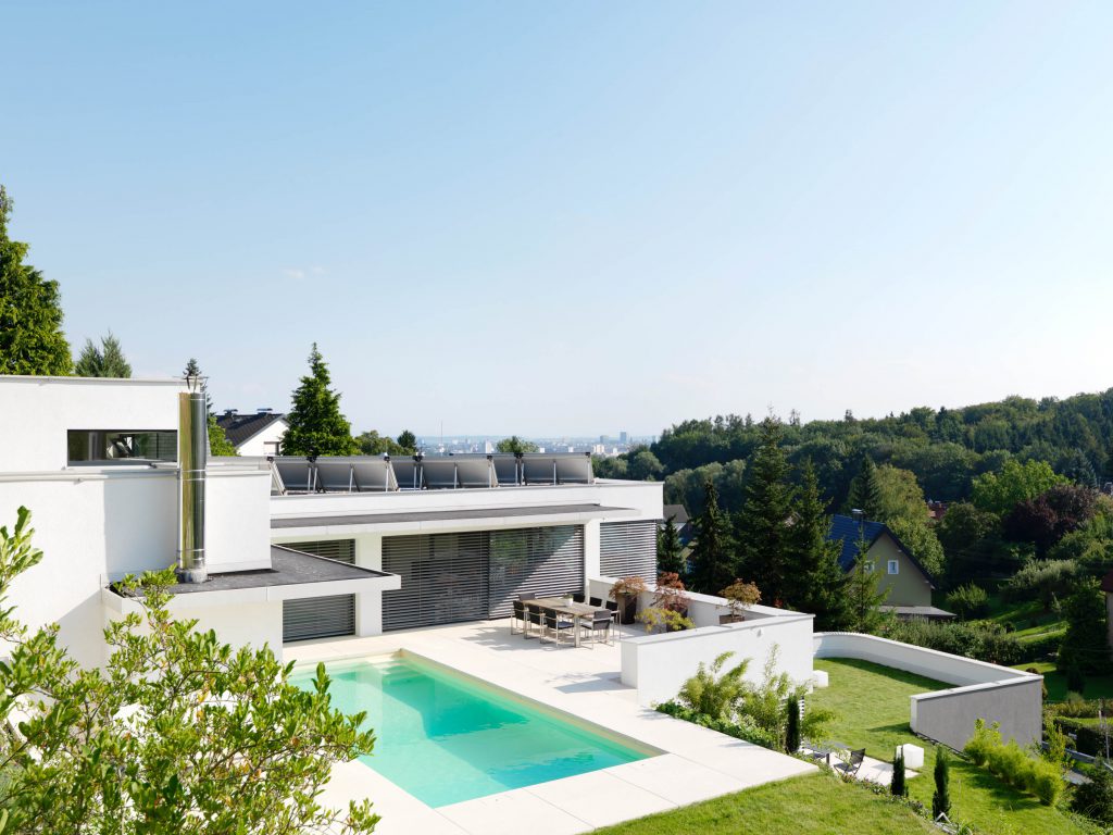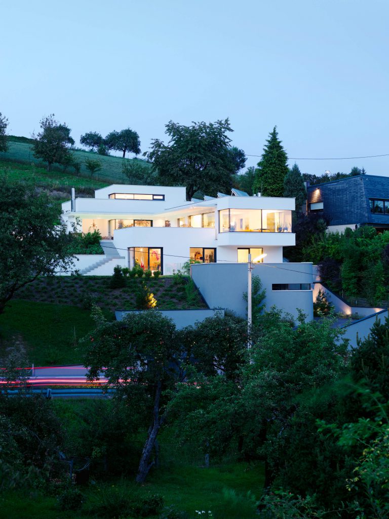 Das Haus staffelt sich über drei Ebenen den Hang hinauf und nutzt geschickt die natürliche Topografie. Eine geradläufige Kaskadentreppe erschließt die einzelnen Geschoße. Die unterste Ebene als Ankunftsebene gibt sich baulich und farblich (anthrazit verputztes Mauerwerk) reserviert und beinhaltet neben der Doppelgarage auch den semiprivaten Bereich der Praxisräumlichkeiten der Bauherrin. Ein kleines, japanisch anmutendes Atrium schafft die natürliche Belichtung des introvertierten Therapieraumes und schafft zusätzlich einen besonderen Gestaltungsakzent. Die darüberliegende Ebene ist das Geschoß der Kinder von wo aus man die nächste Ebene – die Zonen des Alltags mit Kochen, Wohnen, etc. erreicht. Durch Schiebeelemente, vollflächig verglaste Gebäudefronten und große Fensteröffnungen öffnet sich diese „Aussichtsebene“ zur Terrasse mit dem Pool hin zum Garten und gibt den Blick über das gesamte Gebiet der Stadt Linz frei. Rechtwinkelig zum Wohnbereich angeordnet und die Terrasse winkelförmig begrenzend, befindet sich der private Rückzugsbereich der Bauherrschaft mit Schlafempore, Sanitärraum, WC und Schrankraum. Schlüssig aus der Gebäudeentwicklung ergeben sich terrassiert angelegte Freiräume die jeweils eigene Bereiche darstellen.