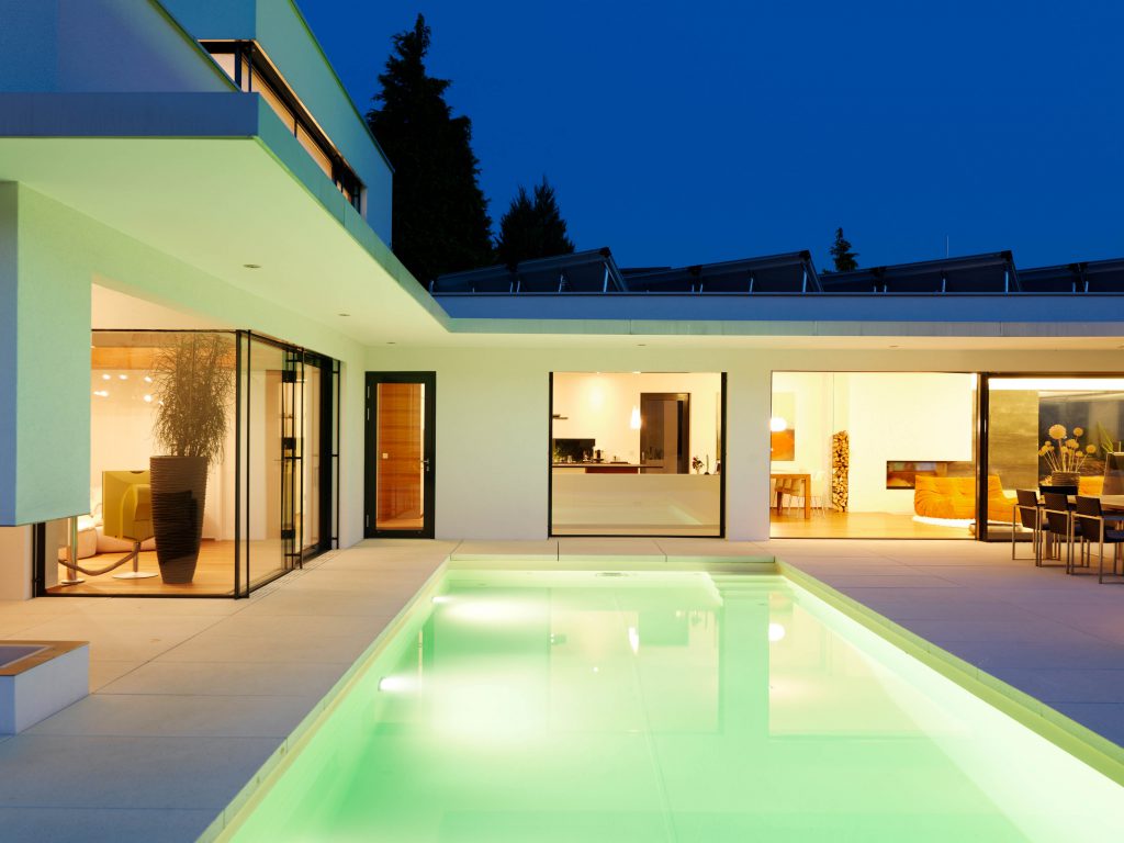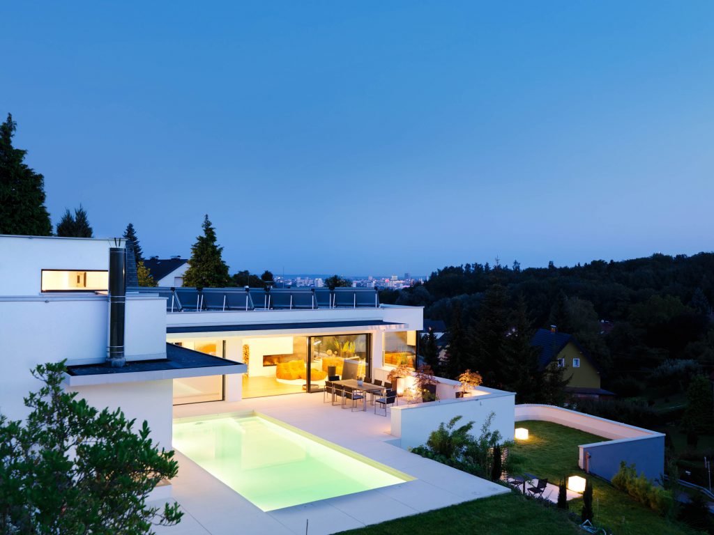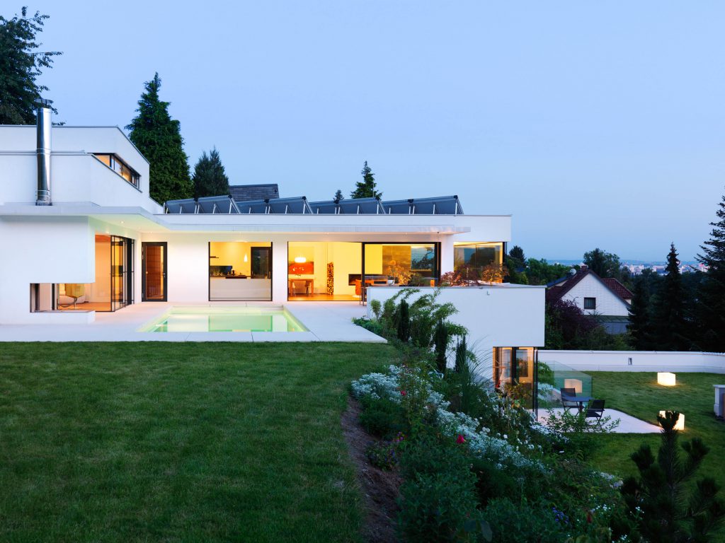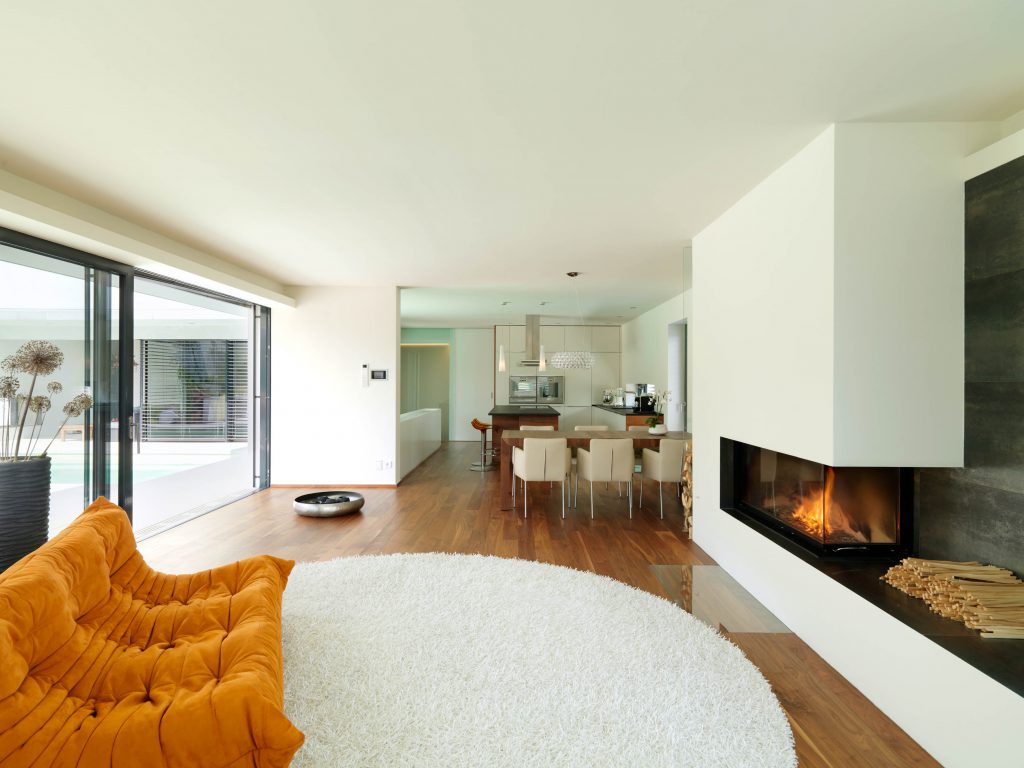 Die geometrische und monochrome Klarheit der Gebäudehülle setzt sich in den Innenräumen fort. Großteils offene Grundrisse, weiß verputzte Oberflächen, einheitlich durchlaufende Bodenbeläge, Verglasungen und Schiebeelemente auf den Wohnebenen bestimmen das Innenleben.