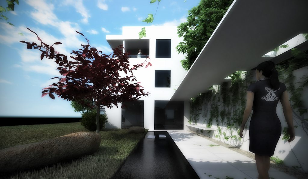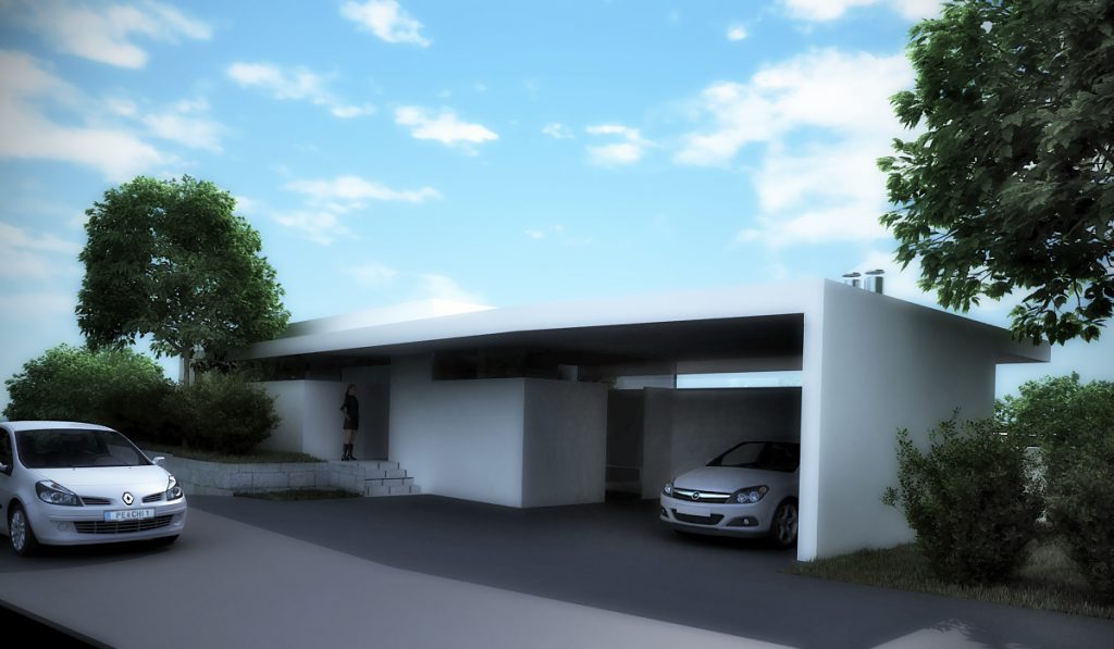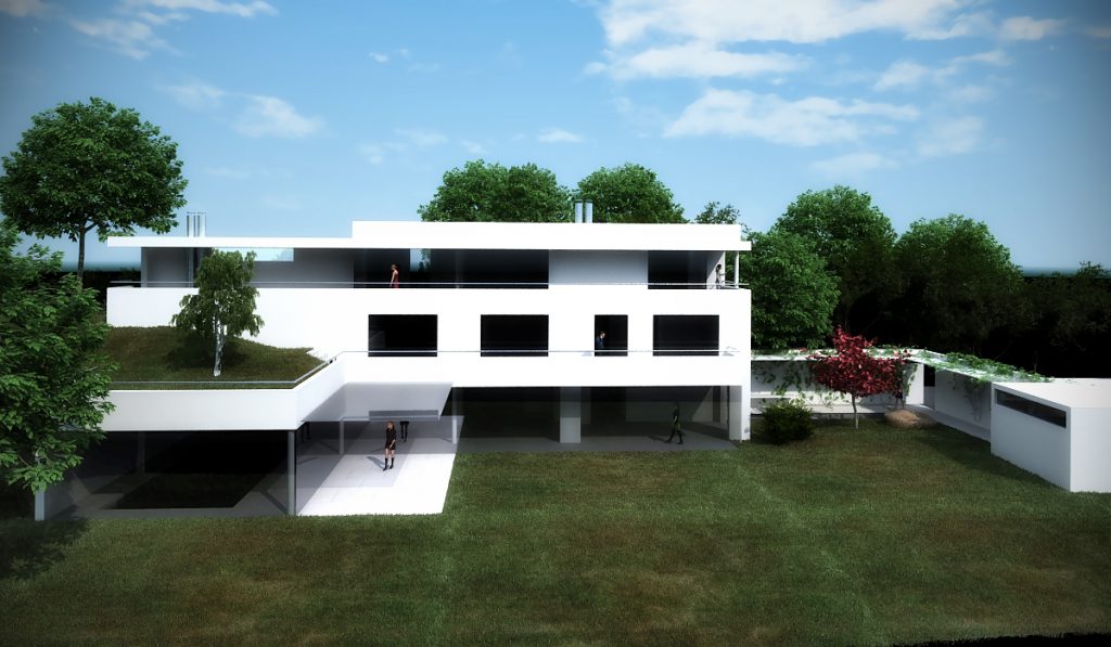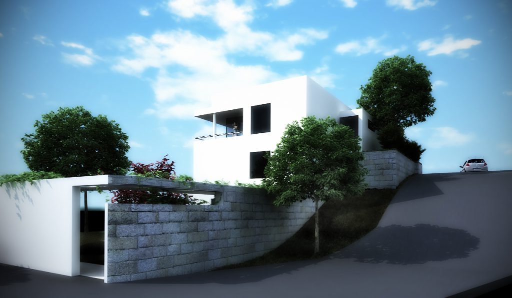 Aufgrund der Tatsache, dass sich zwei getrennte Wohnungen im Haus SCH befinden, ergeben sich logisch-funktionell dem Geländeverlauf entsprechend zwei Eingänge: im Westen oben, an der Hangkuppe: Carport und Zugang für die Wohnung im Obergeschoss, in entgegengesetzter Richtung (Osten), am Fuß des Hanges ebenfalls eine Garage bzw. der Zugangsweg für die größere, zweigeschossige Wohneinheit. Die Platzierung jener Doppelgarage in Verbindung mit einer rechtwinkelig dazu „eingefädelten“ Wandscheibe ergibt eine u-förmige Bebauung des Grundstücks, welche die Geschlossenheit nach außen betont. Ein Durchgang in dieser „Klammer“ führt auf den gedeckten Zugangsweg, der in seiner Längsachse von einem schmalen, geometrischen Wasserbecken begleitet und begrenzt wird. An dieser Stelle tritt das Element Wasser zum ersten Mal in Erscheinung. Ein Blick nach Süden erlaubt einen ersten Eindruck vom Garten, auf den sich das Gebäude auf verschiedenste Weise orientiert und öffnet.