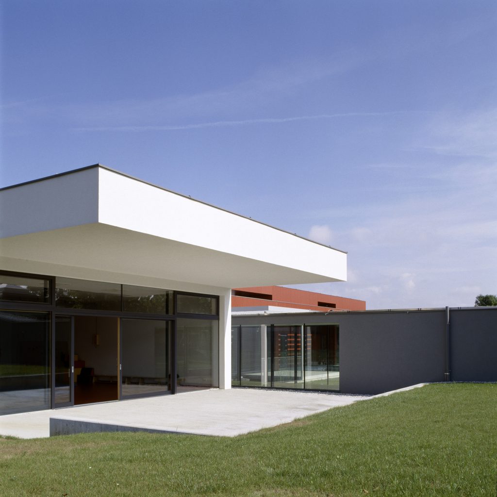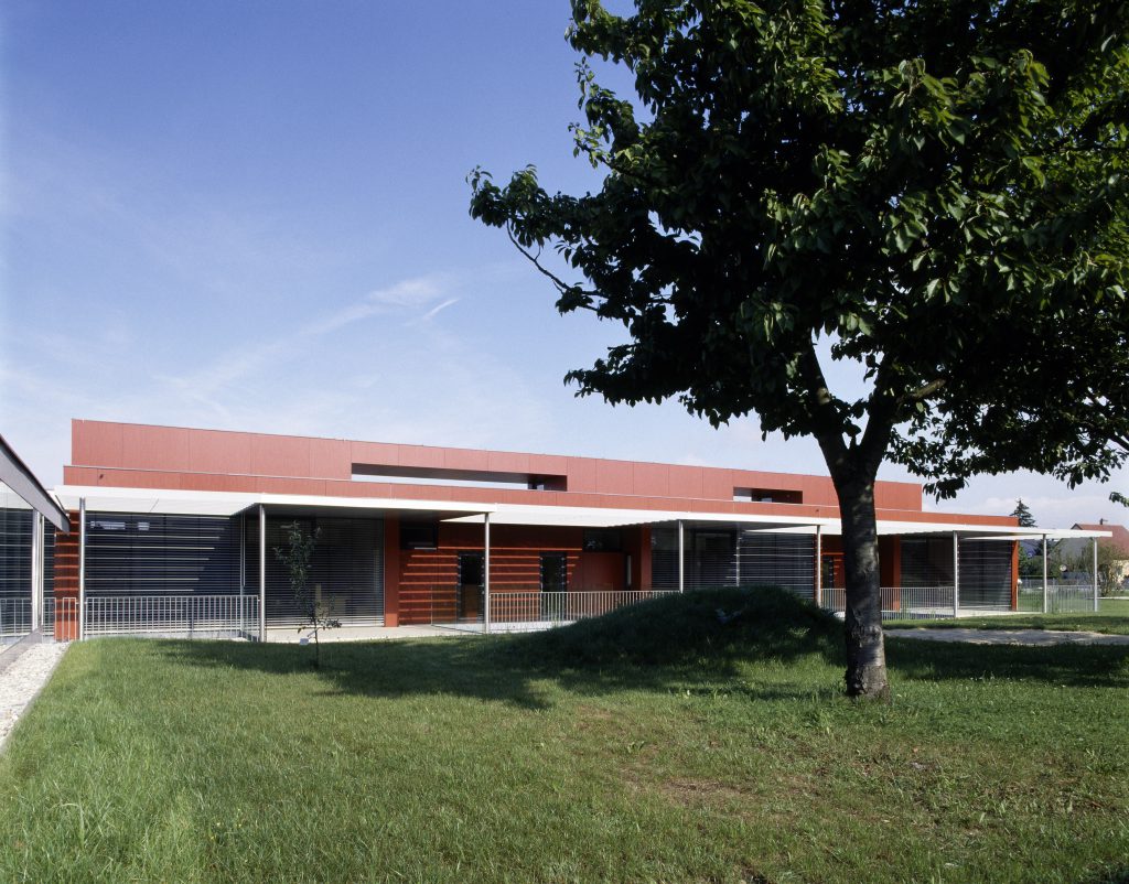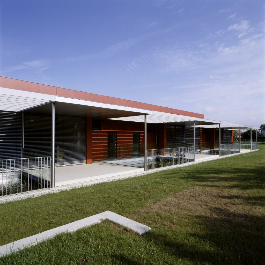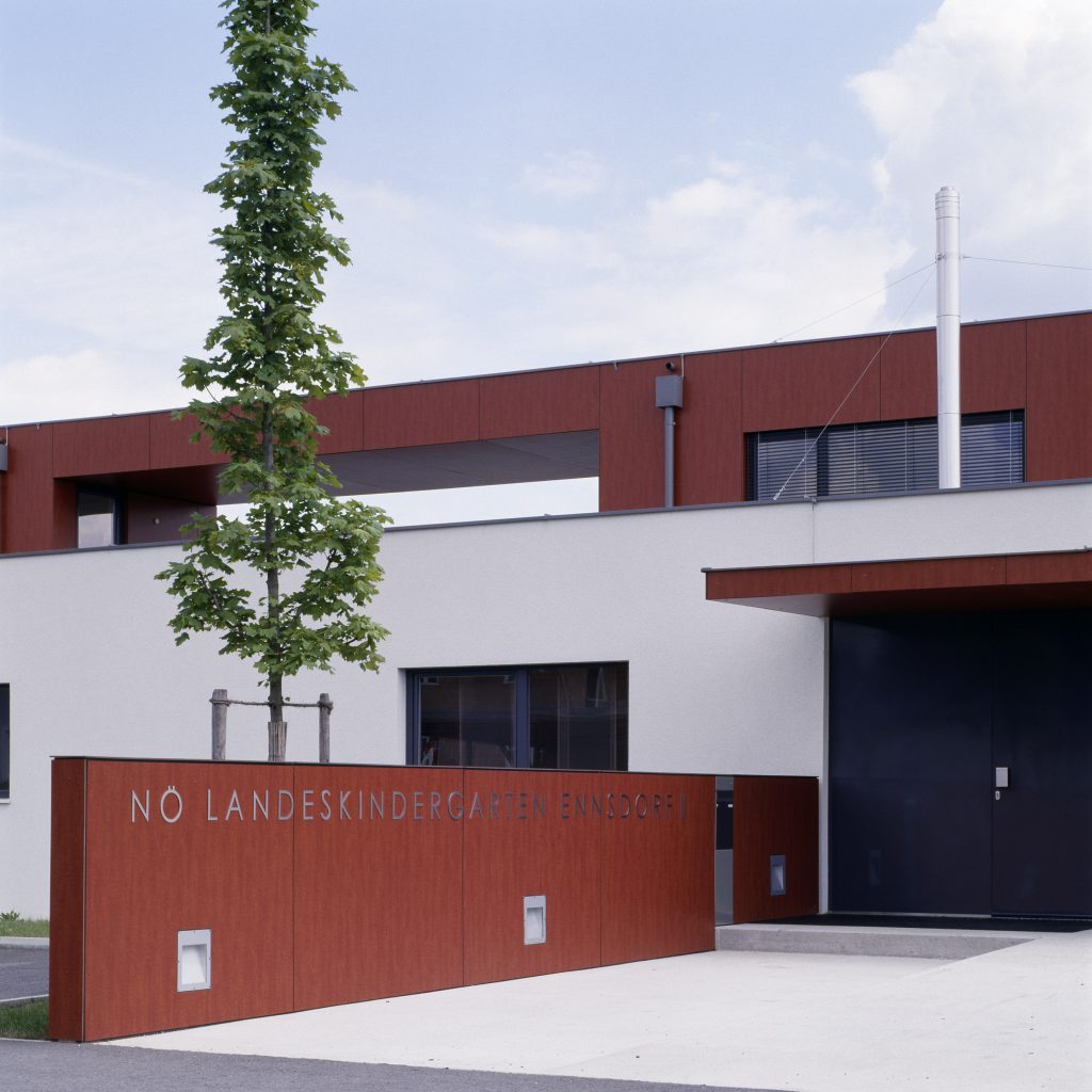 Ennsdorf ist eine der wenigen Gemeinden mit zunehmender Anzahl an Kindern. Auf Grund des daraus resultierenden Bedarfs an Kinderbetreuungseinrichtungen wurde der bestehende Kindergarten mit dem eigenständigen Neubau eines zweiten Kindergartens mit zwei Gruppenräumen und einem Hort sowie einem großzügig dimensionierten Bewegungsraum erweitert. Eine Vorgabe war es, den Kindergarten so zu planen, dass eine zukünftige Erweiterung problemlos durchführbar ist. Der bestehende Kindergarten ist mit dem Neubau über einen verglasten Verbindungsgang verbunden, um eine gemeinsame Benützung des neuen Bewegungsraumes zu ermöglichen. Dieser Raum öffnet sich über eine raumhohe Glasfront mit Schiebetüren auf eine große, überdeckte Terrasse und ist dadurch auch bestens für Veranstaltungen der Gemeinde und zur Förderung des Vereinswesens geeignet.