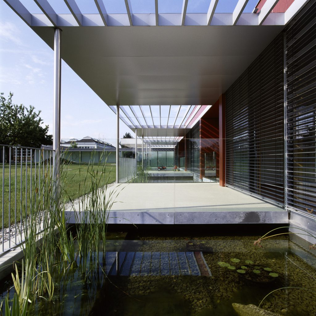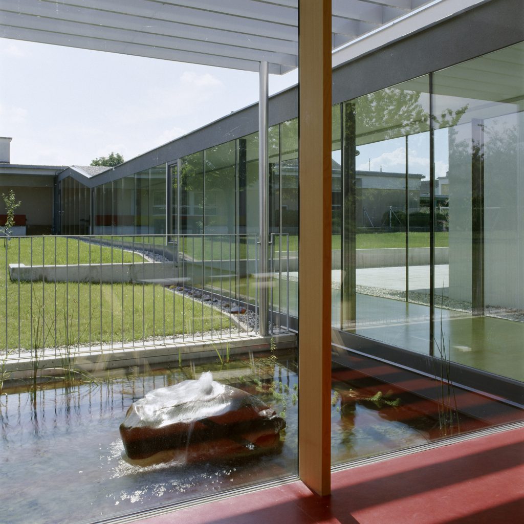 Vor jeden Gruppenraum wurden überdachte, bespielbare Terrassen über das durchlaufende Wasserbecken gelegt, welche die Verbindung zum Garten herstellen. Mit der großzügigen Glasfront zum Garten und Biotop wird die Grenze zwischen Innen und Außen verwischt. Den Kindern wird dadurch das Beobachten der jahreszeitlichen Veränderungen im Biotop und Garten ermöglicht und somit eine Sensibilisierung für die Vorgänge in der Natur erreicht.
