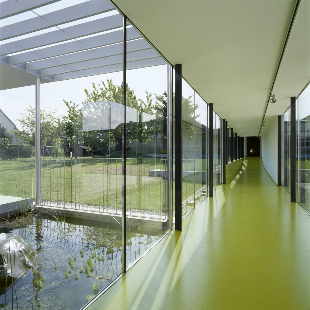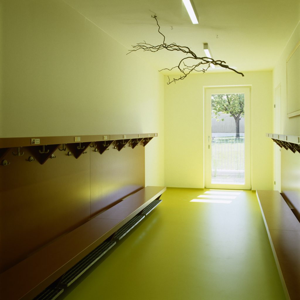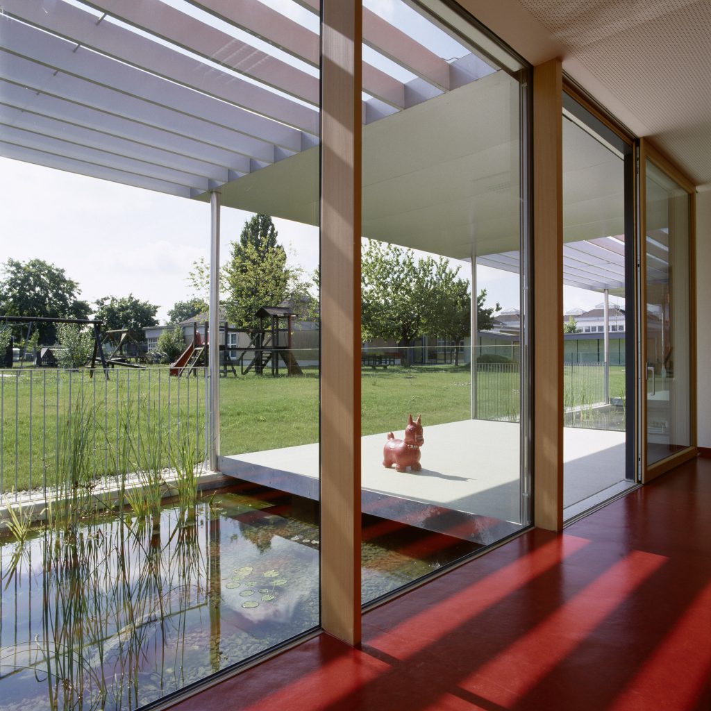 Die Gruppenräume und der Hortgruppenraum sind nach Osten hin zur Vormittagssonne orientiert. Jeder Gruppenraum öffnet sich über die gesamte Raumbreite mittels einer Glasfront mit Schiebetüren in den äußerst großzügigen Garten. Der Grundriss des Kindergartens ist durch klare Orthogonalität gekennzeichnet. Die beiden Primärfarben gelb und rot bestimmen Bodenbelag und einzelne Wandflächen und schaffen eine belebende Stimmung. Den Gruppenräumen direkt vorgelagert ist ein 35 m langes Wasser- bzw. Pflanzbecken mit Schilfbesatz und Gräsern, Seerosen, Teichmuscheln und heimischen Fischen wie Bitterling, Stichling und Moderlieschen. Dieses Naturelement wird durch feine naturalistische, aber monochrome Darstellungen des Schilfs auf diversen Glasflächen mittels Klebefolien zitiert. Spielmulden und ins Obergeschoss verlegte Schlafemporen mit separatem Dachterrassenzugang verleihen den Gruppenräumen gebaute Spielmöglichkeiten.