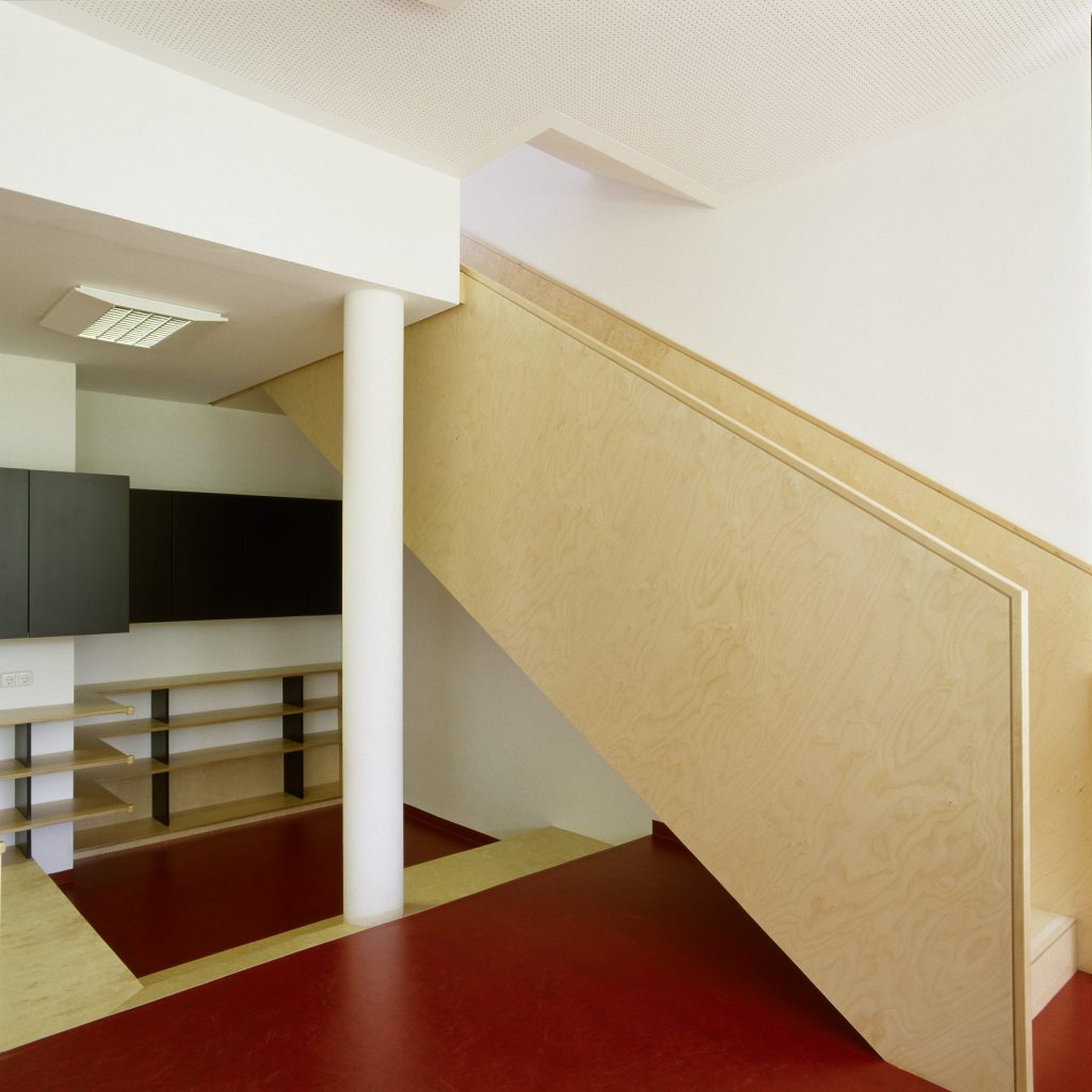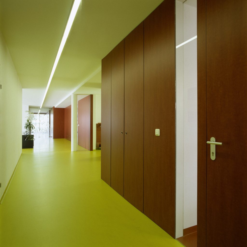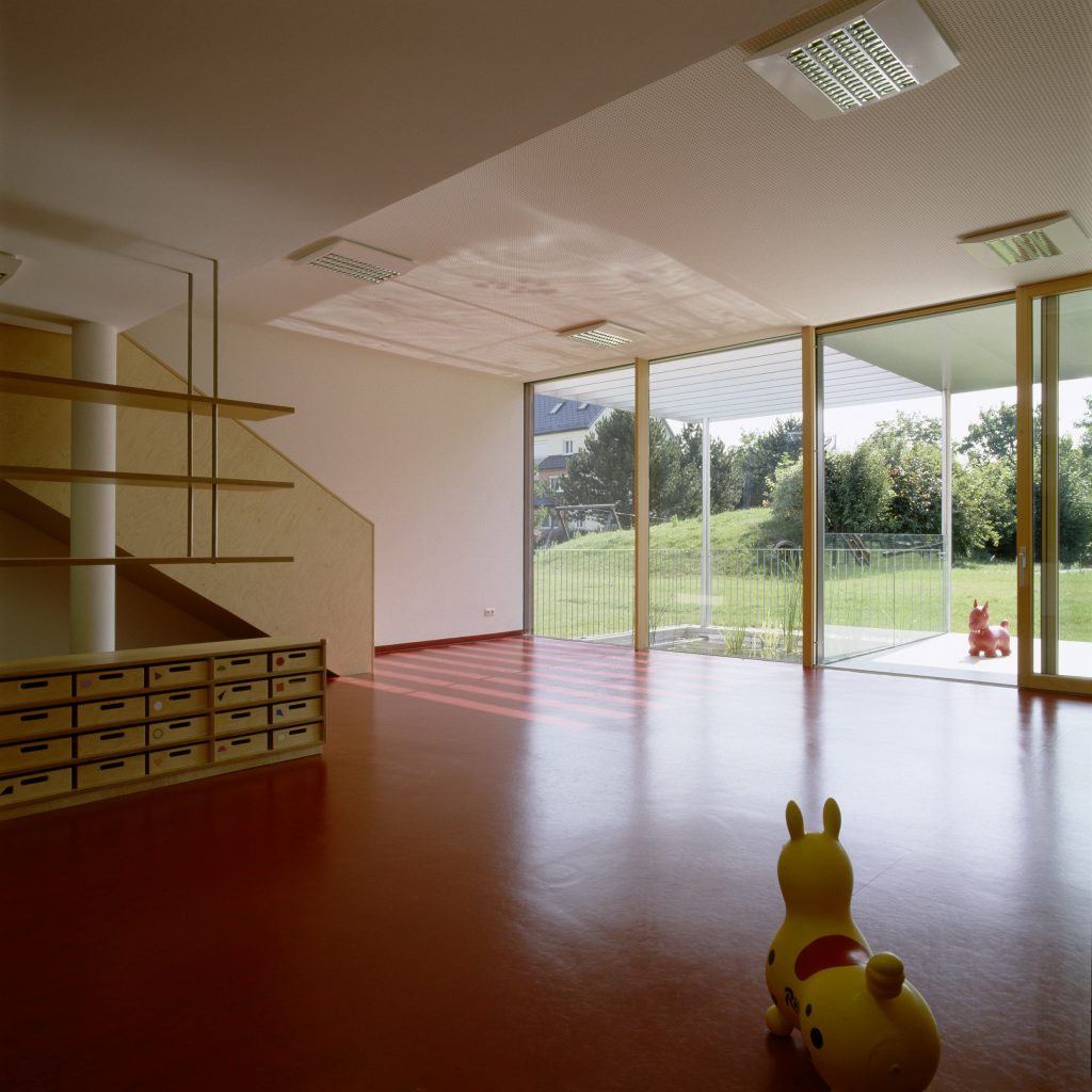 Jedem Gruppenraum ist ein zusätzlicher Raum im Obergeschoss zugeordnet, von dem aus man auf eine überdeckte, bespielbare Dachterrasse gelangt. Das gesamte Mobiliar für Gruppenräume, Leitungszimmer, Besprechungsraum, Küche, etc. wurde ebenso entworfen und gestaltet, um das oft feststellbare Durcheinander mit „Katalogware“ zu vermeiden.