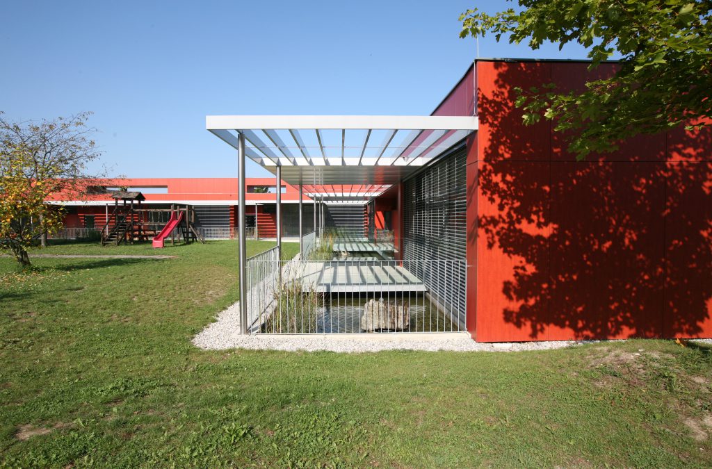 Mit der großzügigen Glasfront zum Garten und zum Biotop wird eine fließende Grenze zwischen Innen und Außen erreicht. Den Kindern wird dadurch das Beobachten der jahreszeitlichen Veränderungen im Biotop und Garten ermöglicht und somit eine Sensibilisierung für die Vorgänge in der Natur erreicht. Das Farbkonzept mit der prägnanten, gelben Polyurethan-Beschichtung in den Erschließungs- und Sanitärräumen, den warmen, roten Linolböden in den Gruppenräumen und der rostroten Plattenverkleidung an der Fassade wurde weitergeführt, um ein einheitliches Erscheinungsbild der beiden Bauabschnitte zu erreichen.