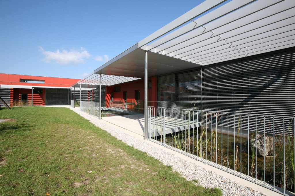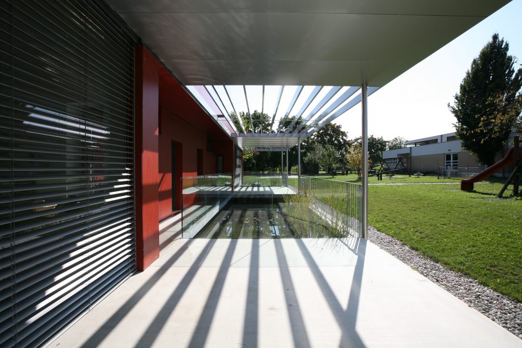 Analog zum ersten Bauabschnitt wurde auch beim Erweiterungsbau den Gruppenräumen ein ca. 25 m langes Wasserbecken vorgelagert, welches mit dem bestehenden Becken des ersten Bauteils verbunden ist und ebenfalls mit Schilf, Gräsern und Seerosen bepflanzt wurde. Die heimischen Fische wie Bitterling, Stichling und Moderlieschen werden den Weg ins neue Wasserbecken finden. Einige Kinder haben Ihre eigenen Goldfische mitgebracht und im Biotop ausgesetzt. Vor jeden Gruppenraum sind überdachte, bespielbare Terrassen über das durchlaufende Wasserbecken gelegt, welche die Verbindung zum Garten herstellen.