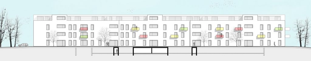 Das bestehende Objekt erstreckt sich in Ost-West-Richtung. Die viergeschossige Südfassade ermöglicht einen überwältigenden Ausblick übers Mühlviertel und Linz bis ins Alpenvorland. Die dreigeschoßige Nordfassade orientiert sich hin zum bewaldeten Hangrücken. Beide Seiten weisen hohe Qualitäten auf und es ist uns ein Anliegen diese Wertigkeiten in die Grundrisslösungen aufzunehmen. Trotz der der großen Baukörpertiefe erschien es uns wichtig, möglichst viele Wohnungen „durchgesteckt“ auszubilden, das heißt Belichtung und Ausblick sowohl von Süden als auch von Norden. Durch die Einschaltung eines zusätzlichen Erschließungskerns in der Gebäudemitte ist es gelungen, sämtliche Wohnungserschließungen als Dreispänner mit jeweils zwei durchgesteckten, Nord-Süd orientierten Wohnungen und einer kleineren nach Süden orientierten Wohnung auszubilden. Diese Lösung ermöglicht es, trotz der unangetastet bleibenden, bestehenden Tragstruktur des Bestandes, hochwertige Grundrisslösungen zu schaffen, welche eine hohe Wohnqualität garantieren. An den west- und ostseitigen Gebäudeenden werden die bestehenden Baukörper (Turnsaal und Lehrertrakt) abgebrochen und durch neue Baukörper mit einem eigenen Erschließungskern in Form von Dreispännern ersetzt. Im Garten- bzw. Untergeschoß befinden sich größere, südorientierte Wohnungen mit Eigengärten. In den nordseitigen Räumlichkeiten hinter dem Erschließungsgang werden die Kellerabteile situiert. Hier werden auch die Schleusen zur Tiefgarage angedockt. Die vorhandene, breite Gangzone wurde bewusst beibehalten, um eine großzügige Distanz zu den Wohnungseingängen zu wahren und einen angenehmen Weg von der Tiefgarage bis zu den Erschließungskernen zu gewährleisten. Nordseitig wird ein Parkdeck mit offenen Stellplätzen in den Hang gebaut. Von hier aus erreicht man auf kürzestem Weg die einzelnen Hauseingänge. Bei zwei Eingängen werden die von außen und teilweise auch von innen zugänglichen Fahrrad- und Kinderwagenräume angeordnet. Durch die Anordnung einer einzigen, kompakten Parkierungsmöglichkeit können die schützenswerten Bäume bei der Zufahrt im Osten erhalten bleiben. Als oberen Abschluss des Gebäudes ist ein rückspringendes Dachgeschoß mit Penthousewohnungen in Holztafelbauweise geplant, welche über die drei neu geschaffenen Erschließungskerne erreicht werden. Diese hochwertigen Wohnungen mit prachtvollen Ausblickmöglichkeiten erhalten sowohl auf der Nord- als auch auf der Südseite großzügige Dachterrassen. Auf der Südseite des gesamten Baukörpers werden Loggien in Holzbauweise, bauphysikalisch entkoppelt, vor die Fassade gestellt. Die vorgesetzte Holzkonstruktion überzieht die Südseite mit einem gleichmäßigen Raster, der eine ruhige Fassade schafft und gleichzeitig dem Sonnenschutz dient. Die Penthousewohnungen und Loggien in Holzbauweise sollen auf Grund ihrer Materialität und Farbe den für die Umgebung sehr massiven, ortsuntypischen Baukörper auf einfache Weise verträglich in die Landschaft integrieren. Im ehemaligen Lehrerwohnhaus wird im Erdgeschoß ein Kaffee mit Garten vorgeschlagen. Im Obergeschoß könnten eine Arztpraxis, ein Büro, eine Hausbesorgerwohnung oder dergleichen untergebracht werden. Dafür sind entlang der Zufahrt eigene PKW-Stellplätze vorgesehen. Insgesamt sind 64 Wohnungen mit 133 Garagen- bzw. Stellplätzen geplant.
