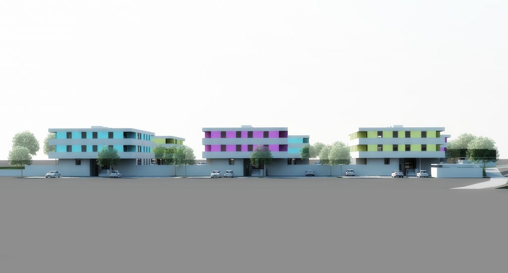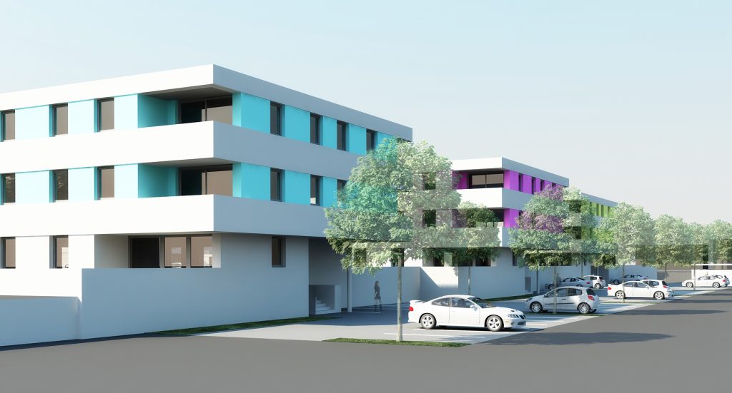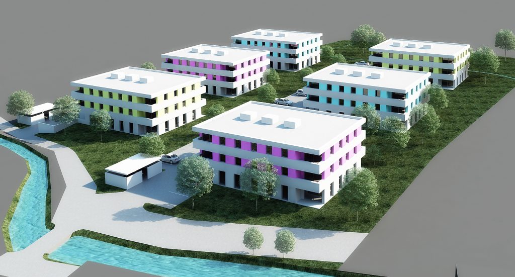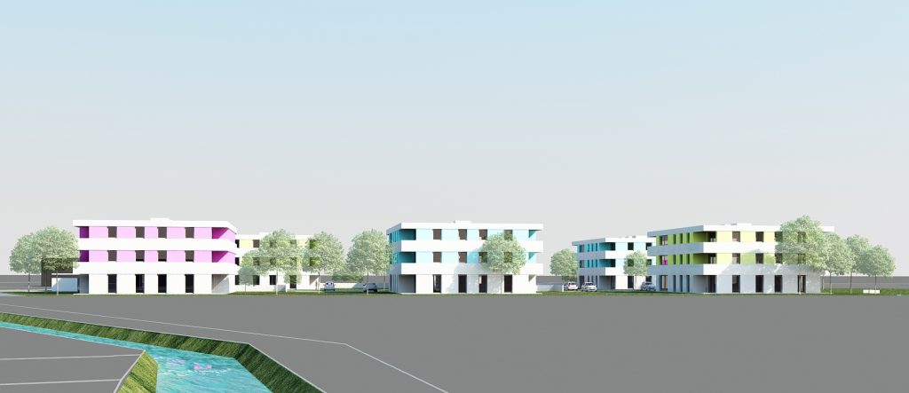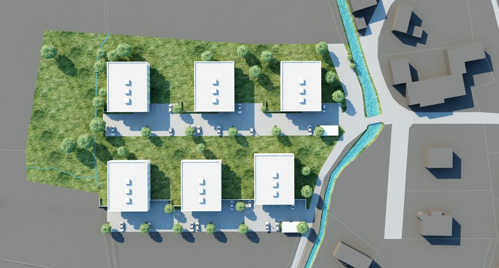 Unsere vorgeschlagene Bebauung sieht sechs Punkthäuser mit insgesamt 66 Wohneinheiten vor. Es sind dreigeschossige Punkthäuser mit innen liegender Erschließung. Sämtliche Wohnungen sind Eckwohnungen, also nach zwei Außenseiten orientiert und verfügen über einspringende Eckbalkone. Die Anordnung der Baukörper folgt der Geometrie des Grundstücks und gewährleistet optimale Licht- und Sonneneinstrahlung. Es entstehen dabei großzügige Grünräume. In jede Himmelsrichtung gibt es schöne Ausblicke und das teilweise Versetzen der Baukörper ermöglicht den Bewohnern diese auch wahrzunehmen. Für die Parkierung haben wir ein sehr wirtschaftliches und rationelles, durch Baum-pflanzungen aufgelockertes System mittels zweier Wohnstraßen gewählt. In die Parkierungszonen ist jeweils ein Müllraum integriert. Die Geländekante im Norden ermöglicht eine sinnvolle Trennung der Grün- und Wohnräume zu den Parkierungsflächen. Jeder Baukörper ist von der Parkierungszone mit einem direkten Zugang zu den zentralen Stiegenhäusern mit optionalem Lift erschlossen. Direkt im Eingangsbereich befinden sich der Fahrrad- und Kinderwagenabstellraum. Die innenliegenden Stiegenhäuser sind über ein Oberlicht in der Dachebene belichtet. Durch die Ausbildung eines großzügigen Treppenauges erreicht das Licht auch die unterste Ebene und lässt, zusammen mit der großzügig verglasten Eingangszone, den Zugang hell und freundlich erscheinen. Jeder Wohnung ist ein Freibereich bzw. Balkon zugeordnet. Der Bereich östlich des Gerinnes wird als Spiel-, Freizeit- und Erholungsfläche genutzt. Die streng kubischen und kompakten Baukörper werden durch die farblich unterschiedlich gestalteten „Fensterbänder“, den einspringenden Eckbalkonen und den überdeckten Eingangsbereichen gegliedert. Die großteils offene Parkierung erfolgt entlang der Landesstrasse am tiefsten Punkt des Grundstückes. Im ersten Bauabschnitt erreicht man durch Überdeckung des nördlichen Parkstreifens eine Terrassenzone für die Erdgeschoßwohnungen. Die Zufahrt zum Parkplatz entspricht dem Wunsch des Auslobers und die Verkehrsinsel kann belassen werden. Jeder Baukörper ist von der Parkierungsebene mit einem direkten Zugang zu den zentralen Stiegenhäusern mit Lift erschlossen. Entlang dieses Zugangsbereiches befinden sich die Fahrradabstellräume und die Technikzentrale mit entsprechendem Lagerraum welcher dem gewünschten Heizsystem angepasst werden kann. Im zweiten Bauabschnitt ist nur eine Übergabestation vorgesehen.